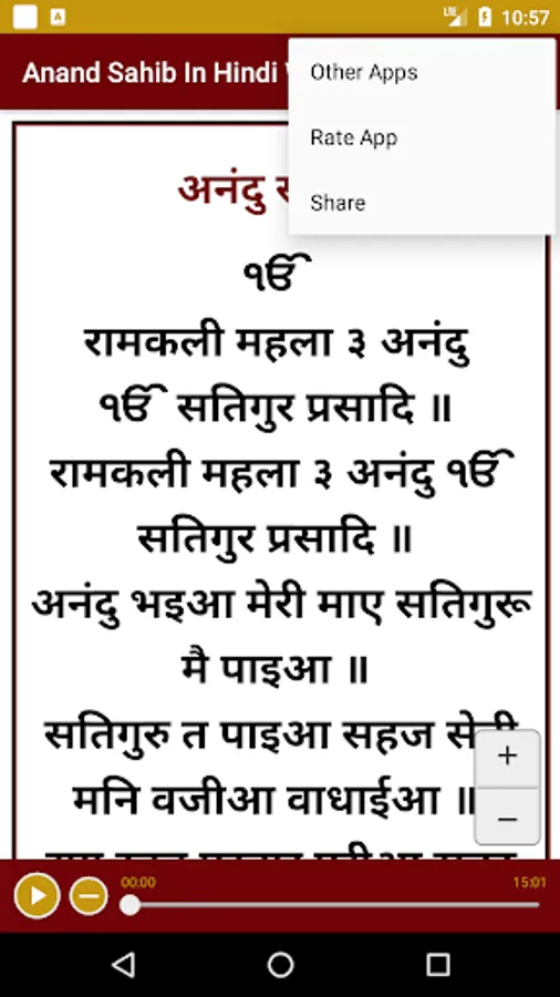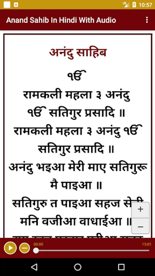 The word Anand means complete happiness. The Anand Sahib is a collection of hymns in Sikhism, written in the Ramkali Raag by Guru Amar Das Ji, the third Guru of the Sikhs. This shorter version of Anand Sahib is usually recited at the closing ceremonies before Ardas. It appears on the pages 917 to 922 in Guru Granth Sahib Ji. Purpose of this app is to let busy and mobile young generation reconnect with Sikhism and Gurubani by reading path on gadgets like mobile and tablets.Features of app listing Audio, Read in hindi langauge in horizontal or vertical mode, Light weight and easy to Install.