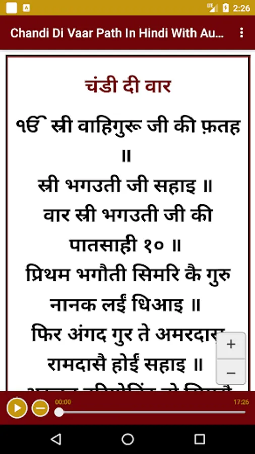Chandi Di Vaar is a heroic composition written by 10th Guru, Guru Gobind Singh Ji at Anandpur Sahib. This is 5th Bani of Dasam Granth Sahib. purpose of this app is to let busy and mobile young generation reconnect with Sikhism and Gurubani by reading path on gadgets like mobile and tablets. Features of app listing Audio, Read in hindi langauge in horizontal or vertical mode, Light weight and easy to Install