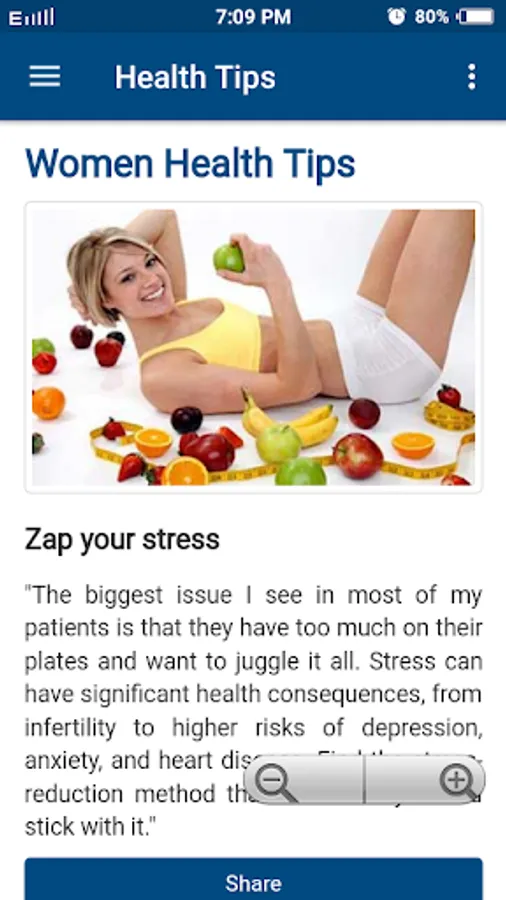 The app has a simple and effective interface to browse through the tips easily. Once you get to the tip details screen you can swipe to left or right to browse through the health tips in the category. These tips are so valuable. This health tips app will provide you most important and common health tips for people.