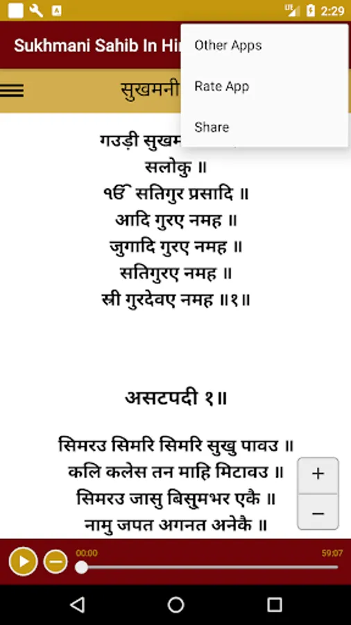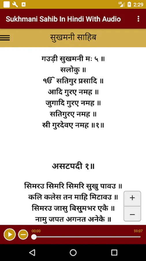 Sukhmani Sahib is the name given to the set of hymns divided into 24 sections. This set of 192 hymns were compiled by the 5th Sikh Guru, Guru Arjan Dev Ji. By using this Bani we can build our inner strength. This Bani gives one the feeling of reliability and dependability on the Lord. Purpose of this app is to let busy and mobile young generation reconnect with Sikhism and Gurubani by reading path on gadgets like mobile and tablets. We hope that you will find this app useful. Please use this app on daily basis, it gives one self-confidence and an upbeat feeling. Features of app listing Audio, Read in hindi langauge in horizontal or vertical mode, Light weight and easy to Install
