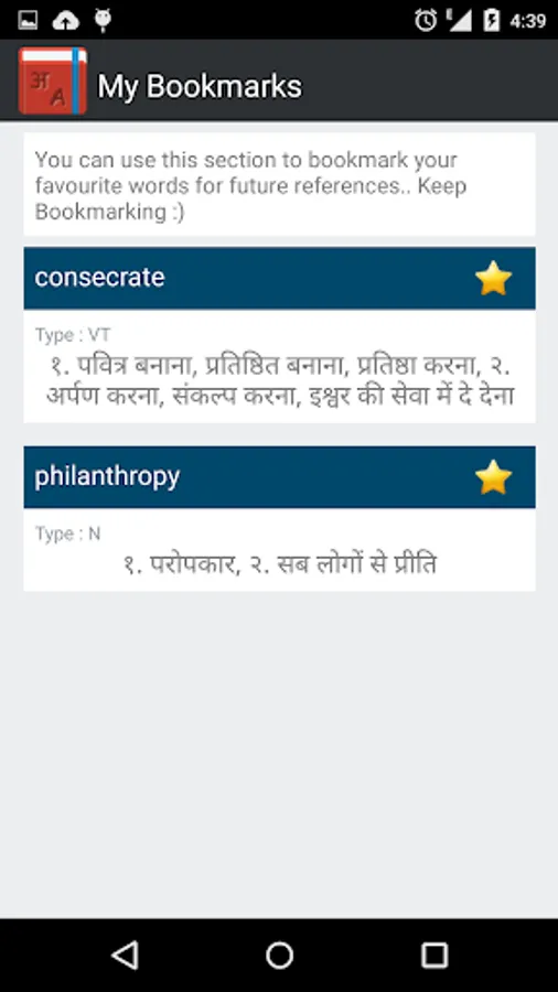 1) Completely offline- once you download the dictionary file, you can use Hindi Dictionary without internet connection