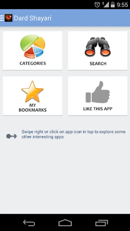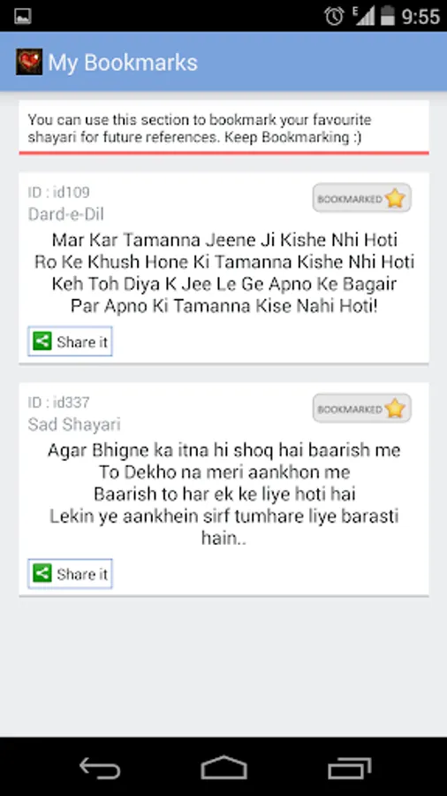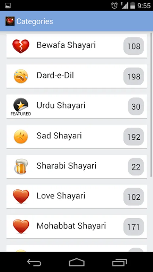 This app will also help you to bookmark favorite shayari for future references. Some of the featured sections of this app are: "Bewafa Shayari", "Dard-e-Dil" or "Dard Shayari", "Sad Shayari", "Urdu Shayari", "Aansu Shayari", "Tanhai Shayari", "Judai Shayari" etc...