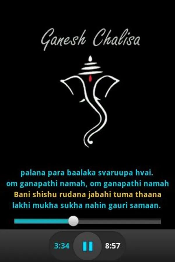 Ultimate Free offline Ganesh Chalisa with user friendly and simple user interface. This app provides audio and lyrics display of Ganesh Chalisa. In addition to this it also highlights the line which is being played by audio player.