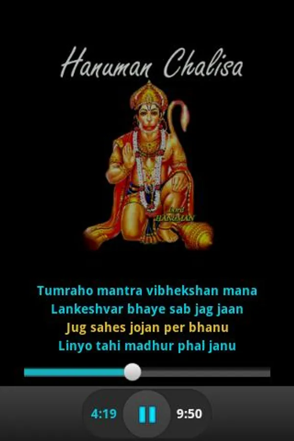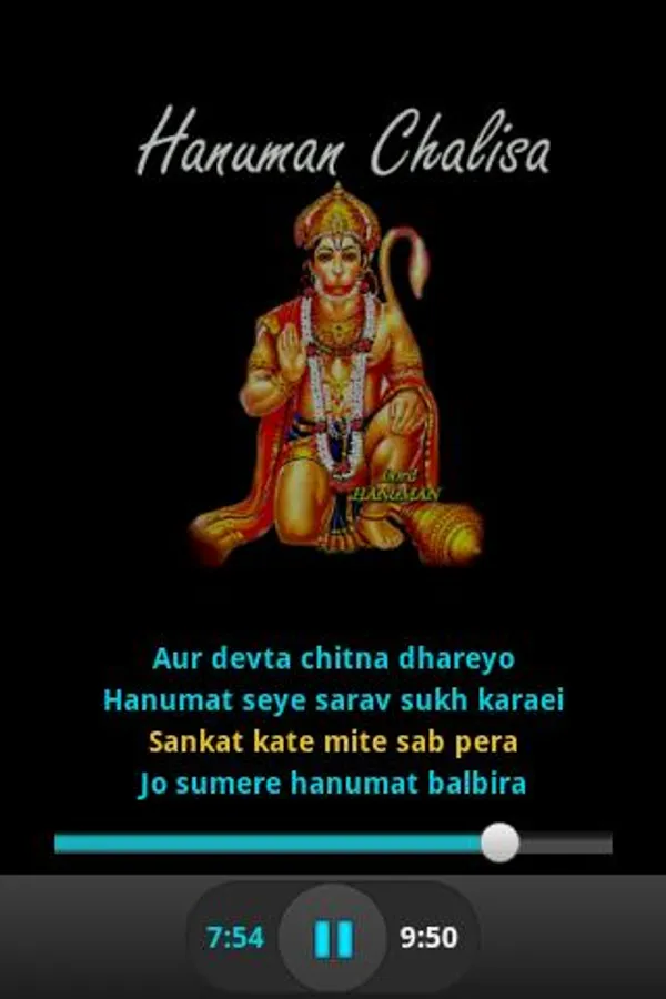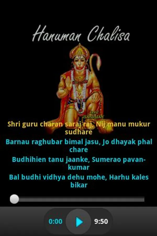 This app provides audio and lyrics display of Hanuman Chalisa. In addition to this it also highlights the line which is being played by audio player.