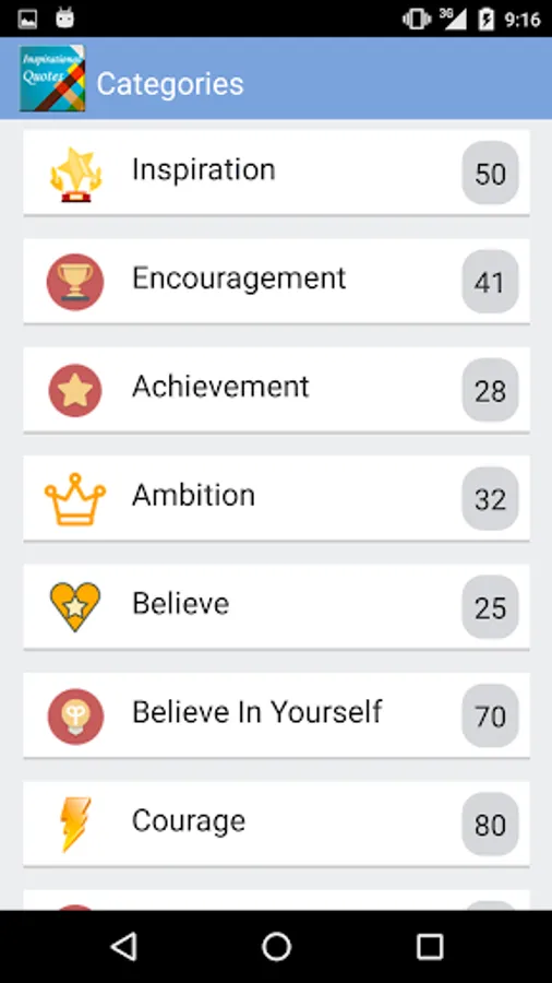 1. Collection of hundreds of quotes in various categories like Inspiration, Encouragement, Achievement, Ambition, Believe, Courage etc.