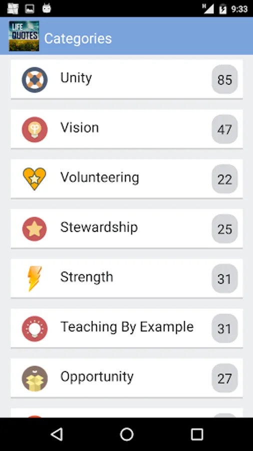 1. Collection of hundreds of quotes in various categories like Strength, Union, Peace, Vision, Character, Purpose etc.