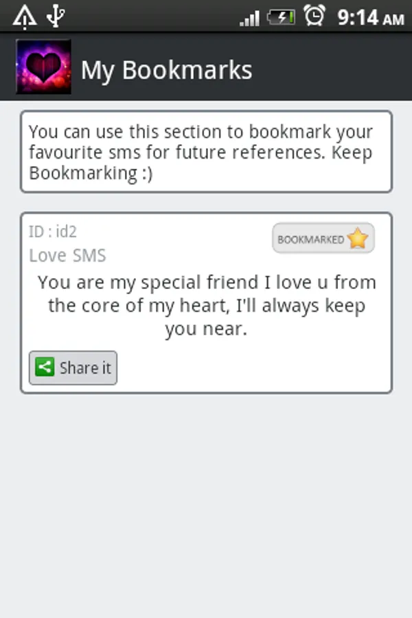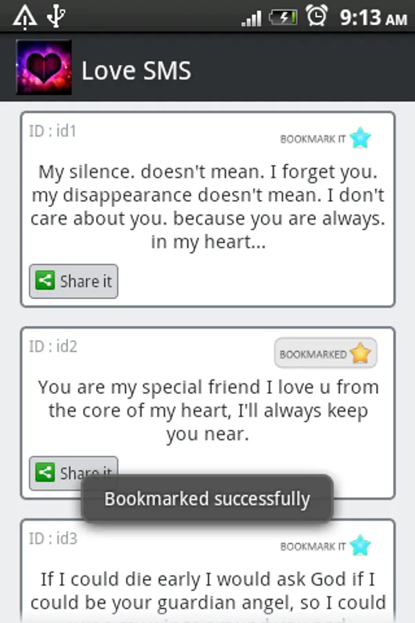 Free Offline collection of +1000 LOVE SMS across various categories. Under this app you can find well categorized collection of Hindi Shayari SMS and messages which you can share with your friends.