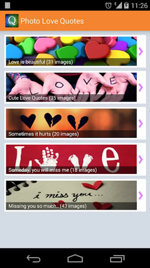 The most intuitive, useful and simple to use Photo Love Quotes application, which have thousands of the best love quotes & sayings! Express your emotions and feelings easily and perfectly with Picture Quotes which stands Free for you. Start sharing on social media or chatting apps.