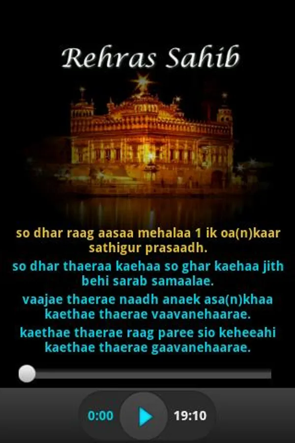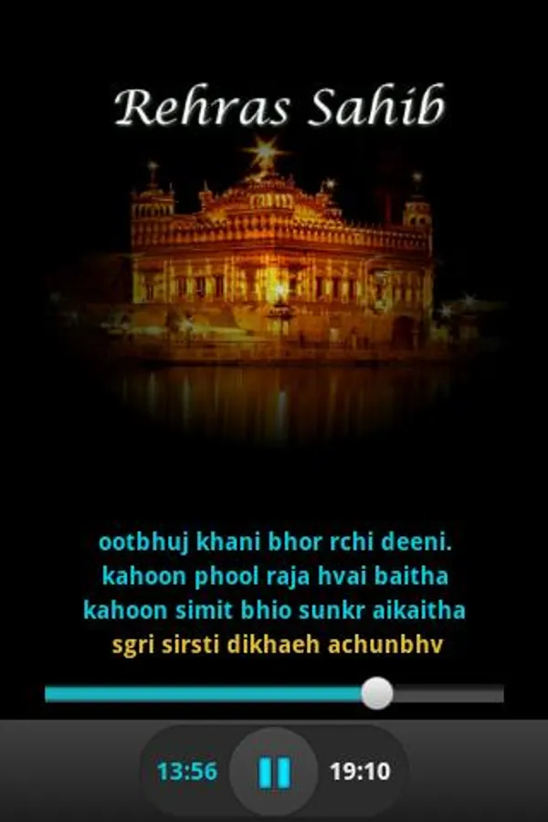 This app provides audio and lyrics display of Rehras sahib. In addition to this it also highlights the line which is being played by audio player.