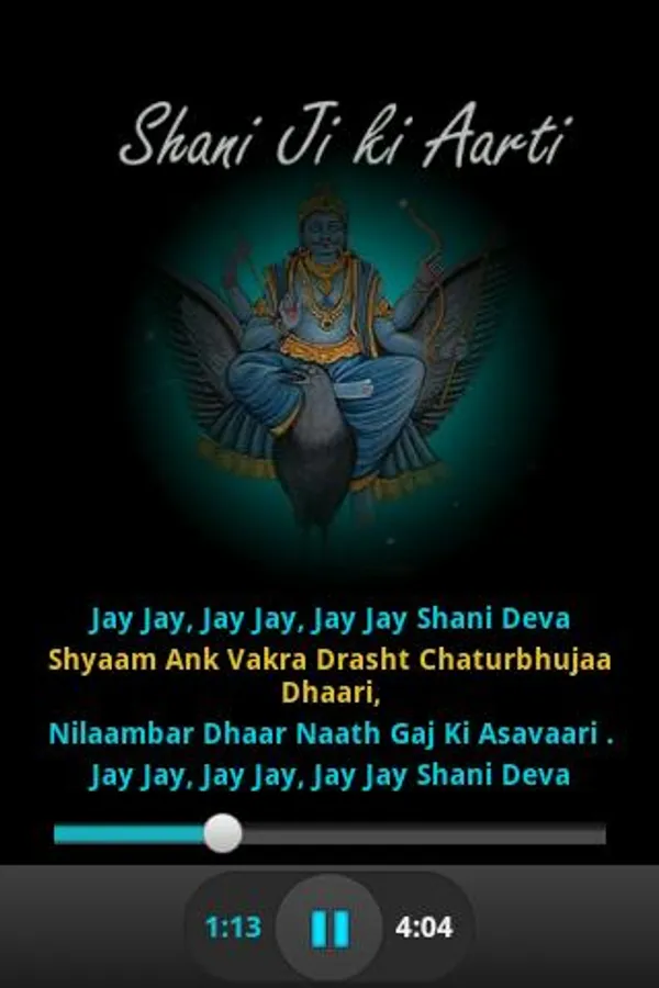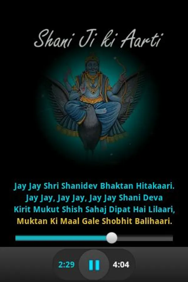 This app provides audio and lyrics display of Shani Aarti. In addition to this it also highlights the line which is being played by audio player.