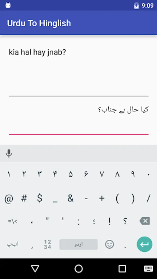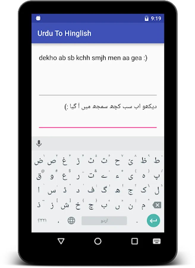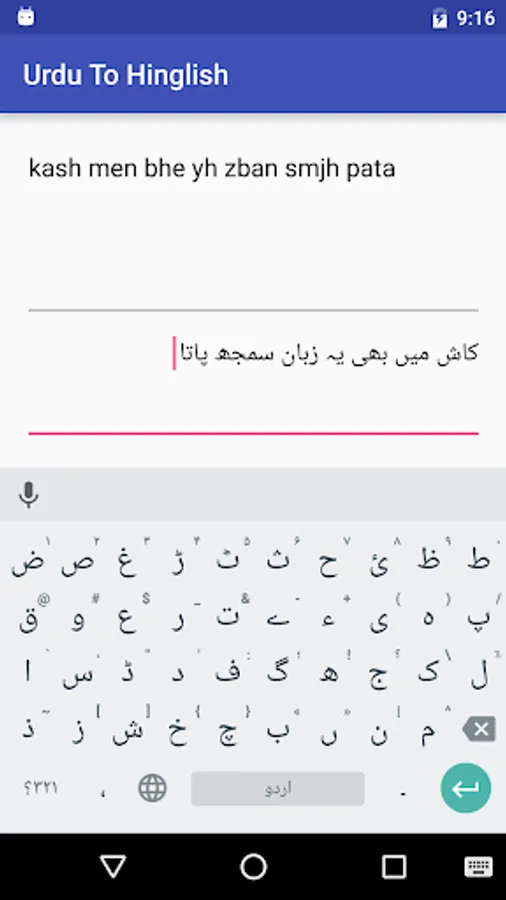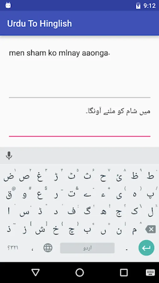 This app converts text written in Urdu script into Roman English also known as Hinglish. Roman English or Hinglish is a form of writing in which english alphabets are used to write non english words in the way they are pronounced. It helps those who know the language but cannot write and read in the native language's alphabets. Hinglish is derived from the words Hindi+English.