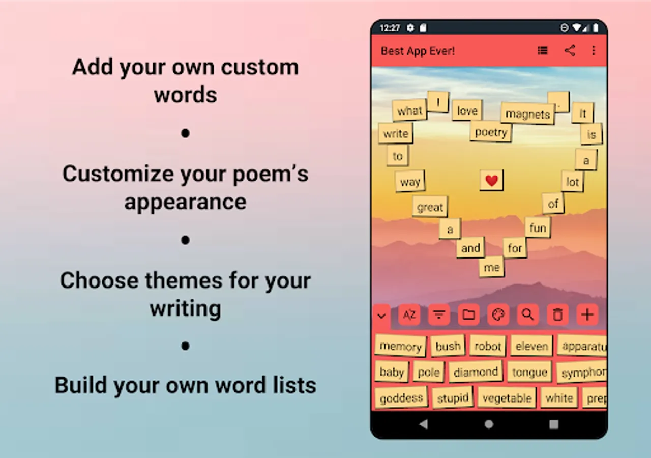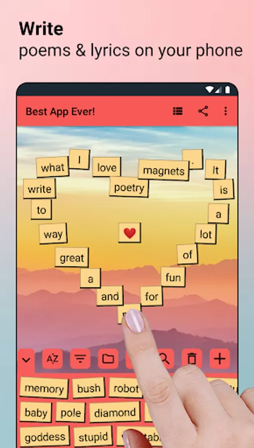 These poetry magnets will both amuse and inspire you with words you've never considered before! A perfect app for poets or English lovers alike, and with over 3,900 words to choose from (and more being added all the time) to give you hours of endless fun and creativity. You can even create your own word lists! Your creative writing needs will be satisfied.
