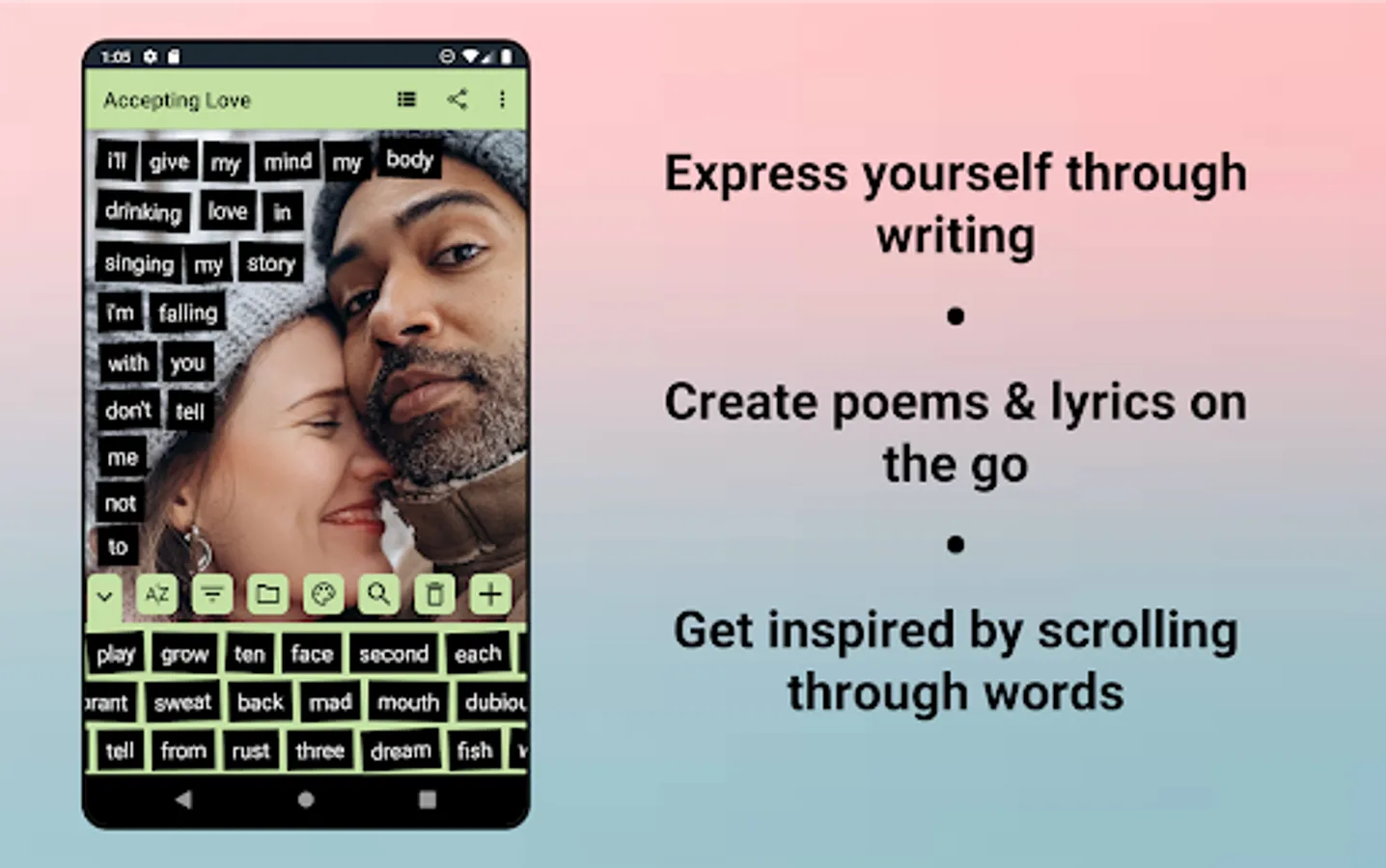 Think of our app as a portable version of fridge poems. Our poetry app has over 7 word lists with over 3,900 words just waiting to be arranged into poems, lyrics, or writing prompts. Anytime, anyplace! Whenever you have 5 minutes, open our poem maker and start writing today.
