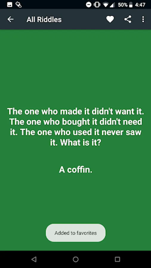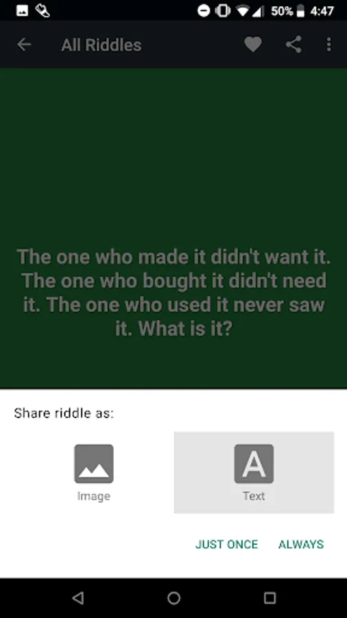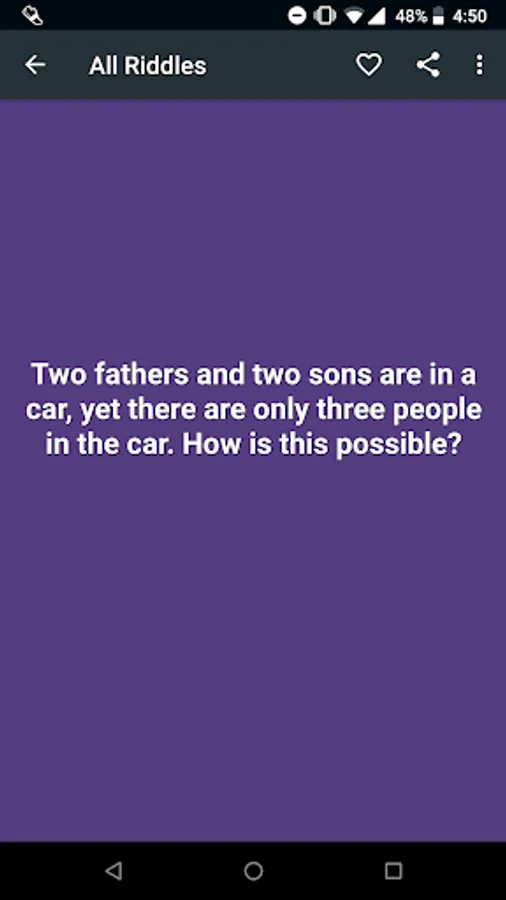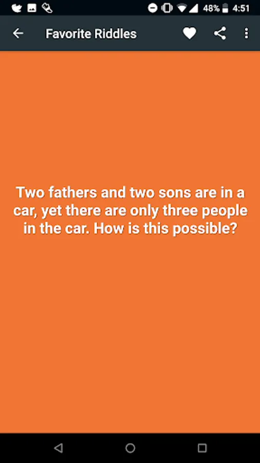 - Share little riddles with friends or family via the convenient share button (you can choose text or image format)