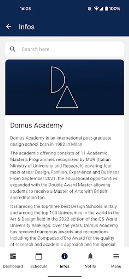 Be always connected with Domus Academy. Check your timetable and classrooms, your attendance and your study plan. Don't miss DA news and events!