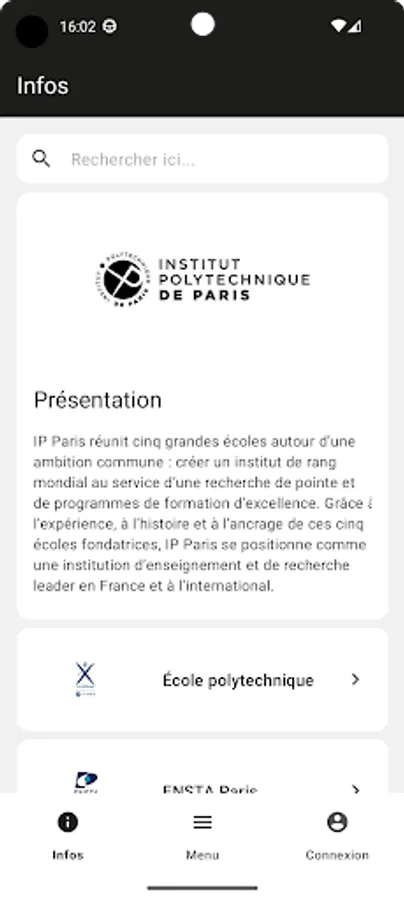 Visiteur, apprenez en plus sur IP Paris et ses Écoles ! Étudiants et personnels des Écoles d’IP Paris, cette application vous offrira bientôt de nombreux services dédiés et personnalisés. L’École polytechnique et Télécom Paris disposent d’ores et déjà d’une connexion personnalisée.