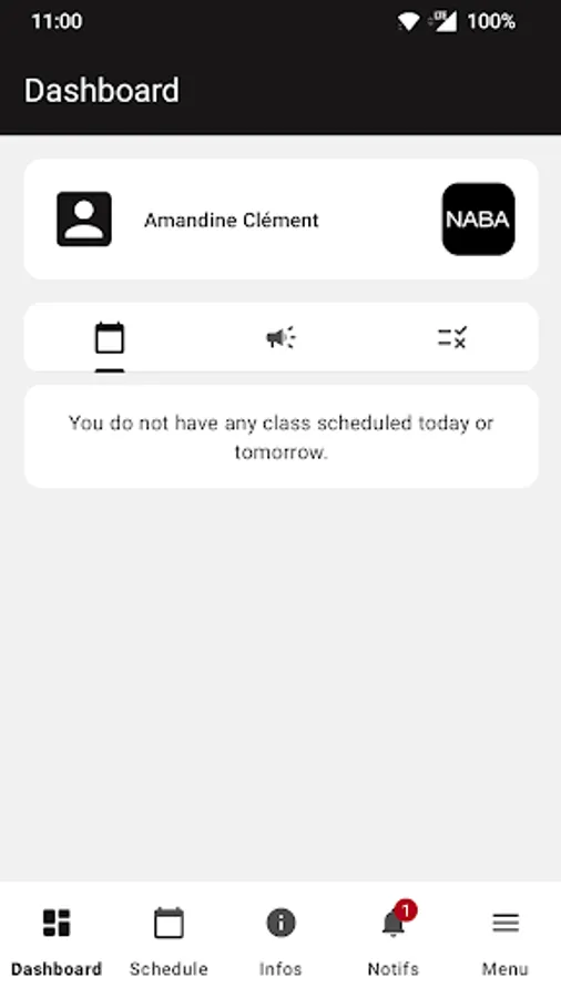 - A dashboard showing the lessons scheduled for the day and the day after