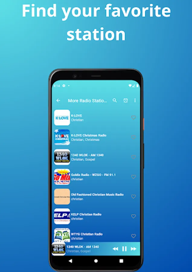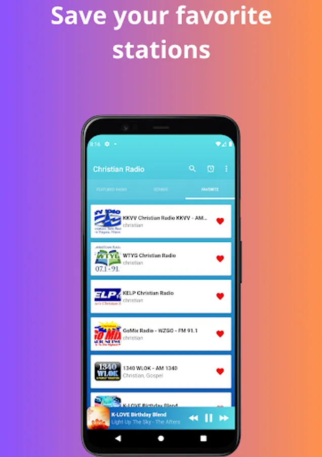 With the Church of Christ app you can enjoy a very good selection of radio station music from different religious station like K-LOVE Radio.