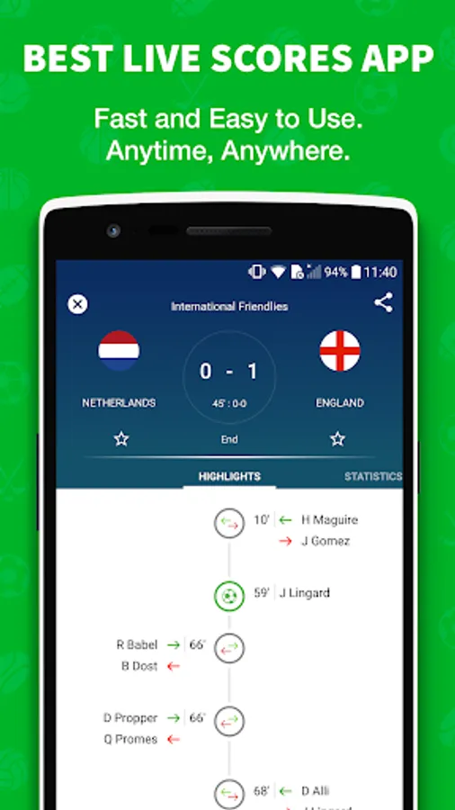 Follow all the live scores and receive customized alerts on scores and goals for teams and games of your choice.
