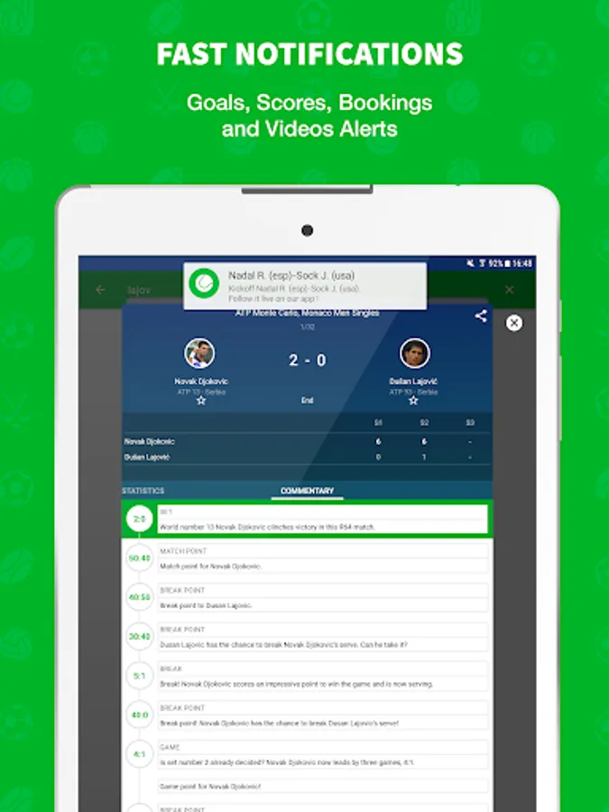 Never miss a sporting moment: Live Soccer (champions league, europa league, liga, serie a, ligue 1, world cup....), Tennis, Basketball, Rugby, Football, Baseball, Handball, Volleyball, and Hockey.