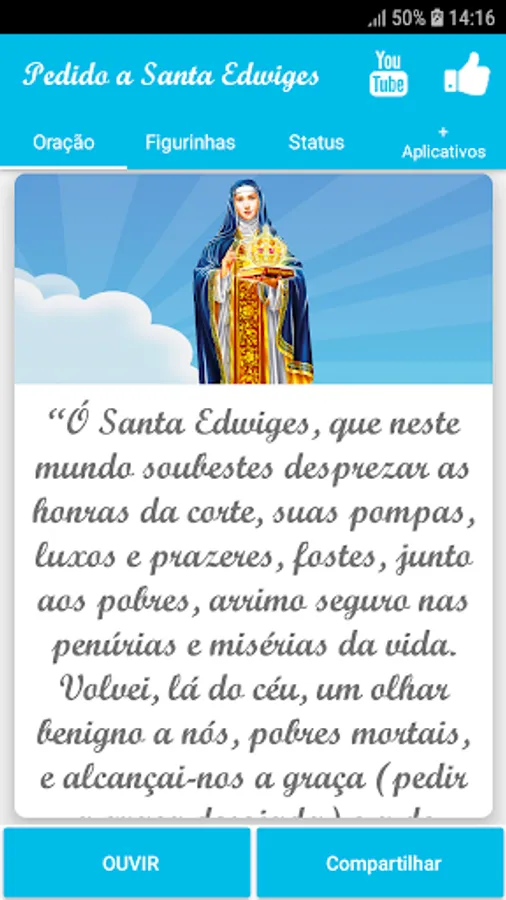 “O Saint Edwiges, who in this world knew how to despise the honors of the court, its pomps, luxuries and pleasures, you were, together with the poor, a safe support in the hardships and miseries of life. Return, from heaven, a benign look to us, poor mortals, and reach us the grace (ask for the desired grace) and to live in the peace and friendship of God, Amen.”