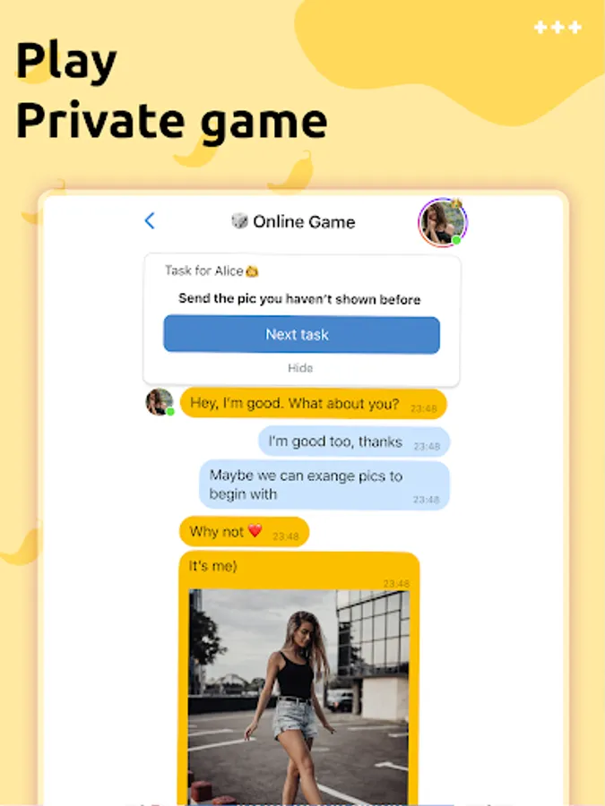 You will be able to chat online, share photos and in the course of communication, jointly perform dirty tasks and answer frank questions (tasks are specially designed considering that you are at a distance from each other).