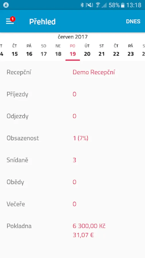 In the Overview section are details of the reception, guests arrivals, departures guests, availability of accommodation, number of breakfasts, lunches, dinners and cash in hand.