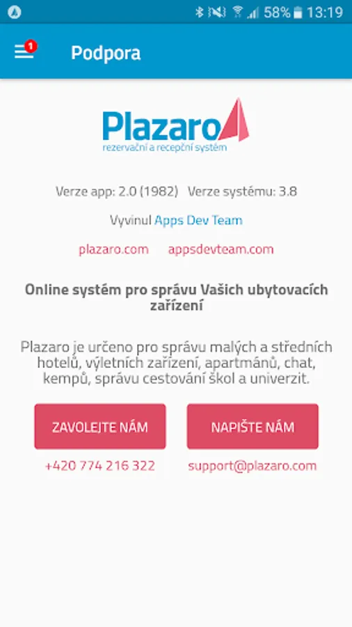 The Support section provides basic information about the online reservation and reception system Plazaro along with quick contacts.