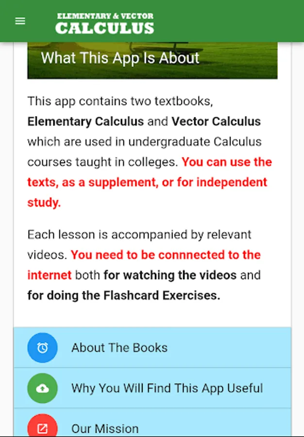 This app contains two classics, Elementary Calculus and Vector Calculus both written by Prof Michael Corral, Professor, Mathematics Department, Schoolcraft College , Livonia, Michigan, USA.