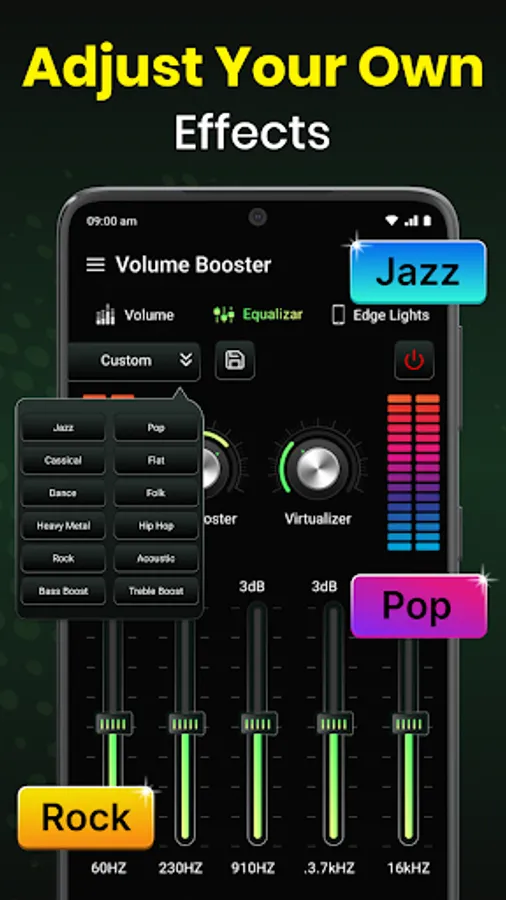 Custom Sound Profiles: Personalize your listening experience with adjustable Music Equalizer settings and a Bass Booster.