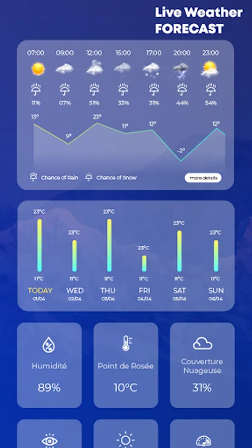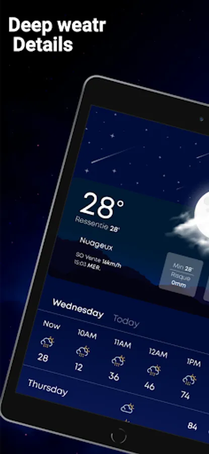 The daily and hourly weather forecast is a weather channel with accurate weather information, it is updated every hour and you can see the weather for today, the next day and also the weather forecast for the next ten days which includes: relative humidity, temperature, precipitation, wind speed and direction, atmospheric pressure, etc.
