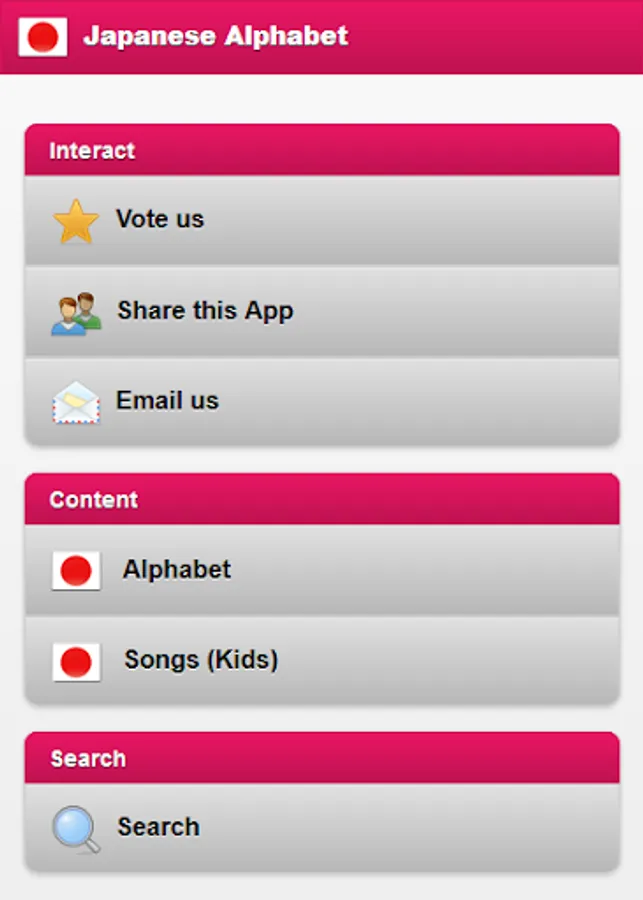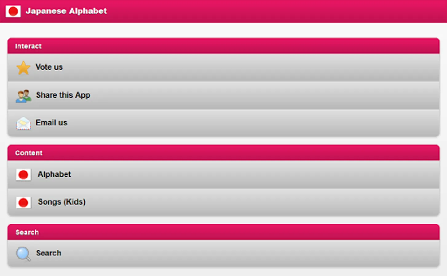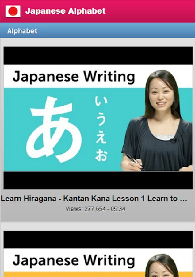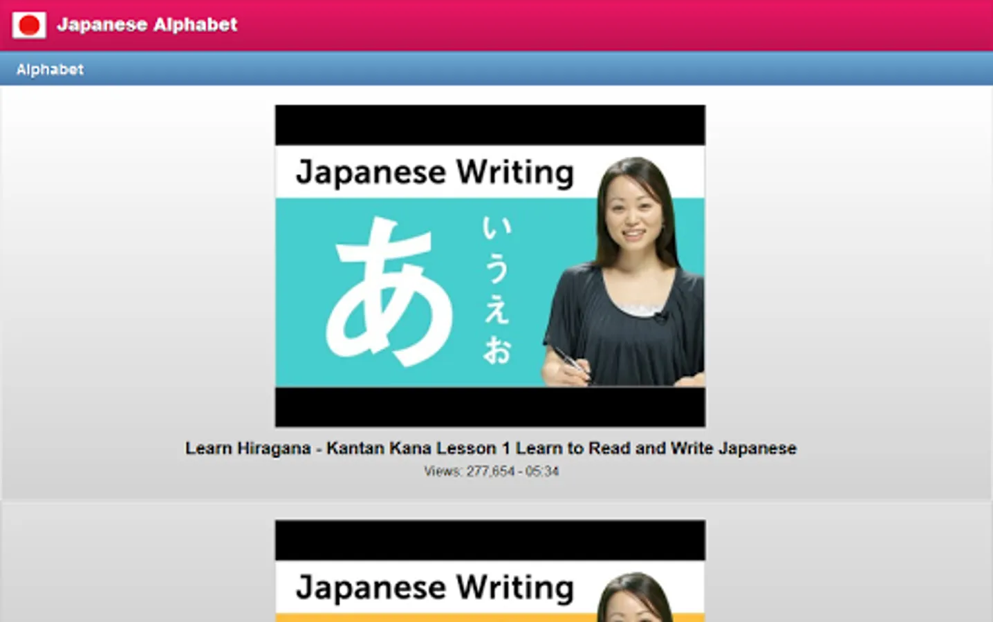 App to learn the Japanese Alphabet. If you want to learn Japanese the first thing you must know is the different alphabets, Kana and Kanji. This application will help you on this job with a selection of simple video tutorials. You will learn the all Japanese letters with ease before getting started with the real language. We also have Japanese Alphabet Songs for kids. It's totally free and very easy to use.