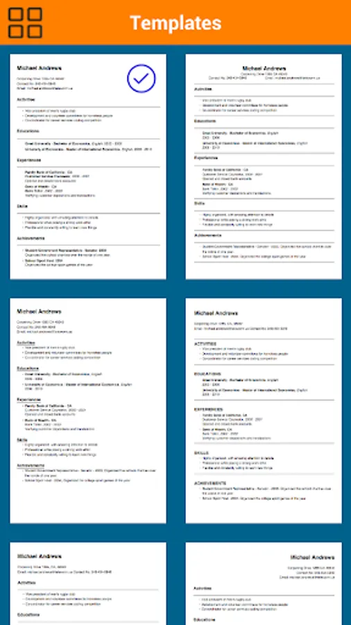 There are 10 templates you can convert your resume to in just a singlet tap. Even better, you can also export your resume to .PDF, DOC and also send it to your email!