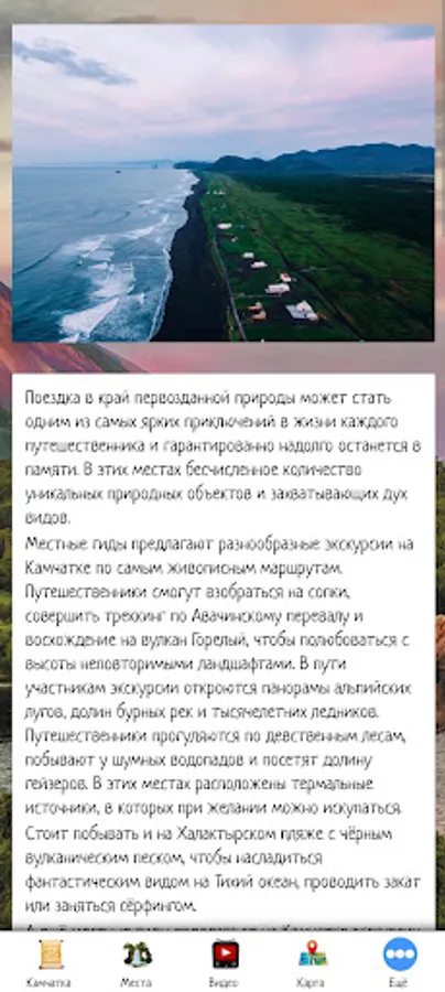 In this application, you can make an initial acquaintance with Kamchatka, choose a place for a trip by looking at the sights and video reviews. Also in the application there is information about tour agencies and hotels offering their services.