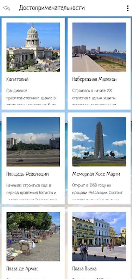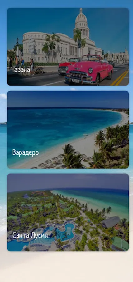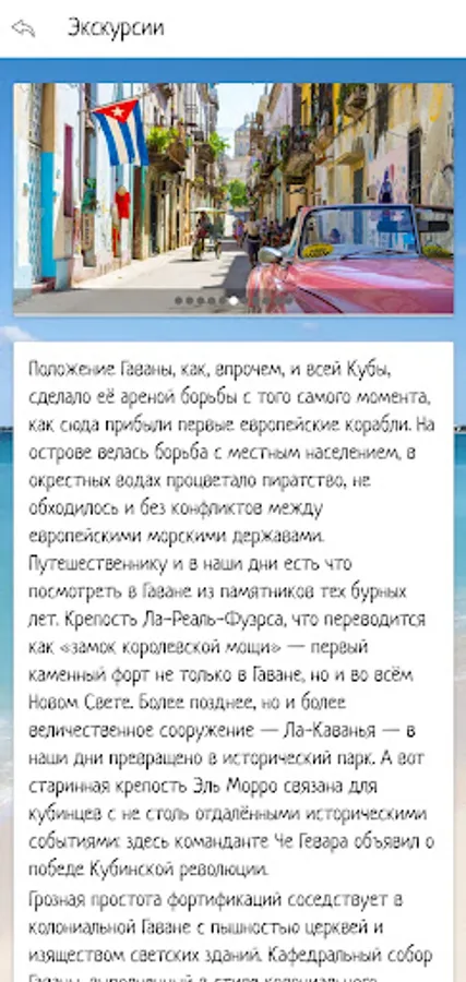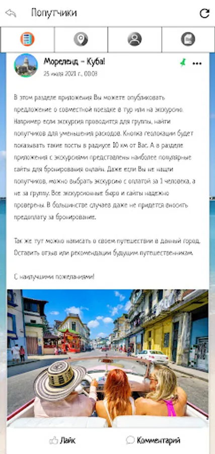 There are times when you are traveling alone or as a couple, and you want to go on an interesting excursion in Cuba, but it is expensive, as the guide charges a group fee. In this application, you can find fellow travelers for joint excursions, and reduce the cost of the tour. In the "Fellow travelers" section of the application, publish your post and it will be visible to other users of the application within a radius of 10 kilometers. And when you click on the "geolocation" icon, you yourself can see other such offers within a radius of 10 kilometers from you! Additionally, in the application, you can make an initial acquaintance with the cities of Cuba, choose a place to travel by looking at the sights and video reviews. The application also contains information about tour agencies, travel agencies and hotels offering their services in the selected city.