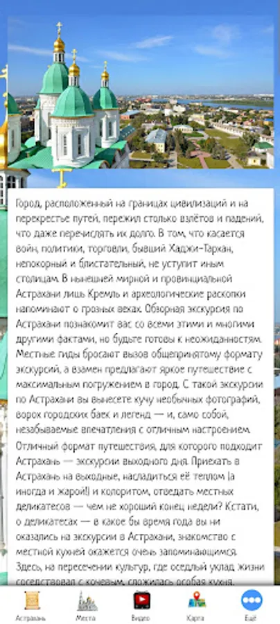 In the application, you can make the first acquaintance with the city of Astrakhan, choose a place for a trip by looking at the sights and video reviews. The application also contains information about tour agencies and hotels offering their services in Astrakhan.