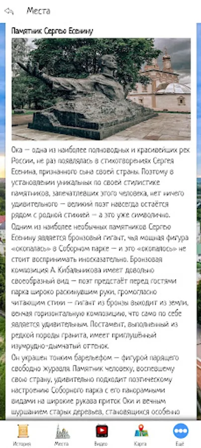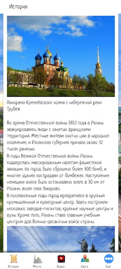 In the application, you can make the first acquaintance with the city of Ryazan, choose a place for a trip by looking at the sights and video reviews. The application also contains information about tour agencies and hotels offering their services in Ryazan.