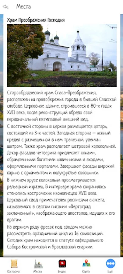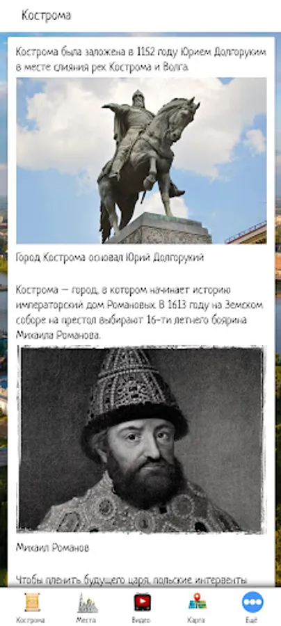 In the application, you can make the first acquaintance with the city of Kostroma, choose a place for a trip by looking at the sights and video reviews. The application also contains information about tour agencies and hotels offering their services in Kostroma.