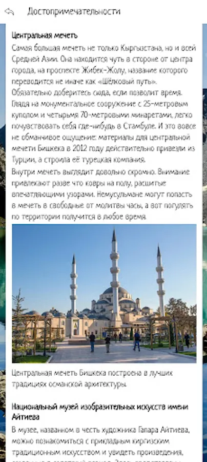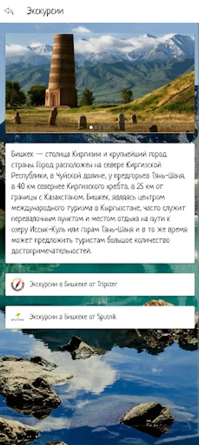 In the application, you can make an initial acquaintance with the cities of Kyrgyzstan, choose a place for travel by looking at the sights and video reviews in Kyrgyzstan. Also in the application there is information about tour agencies and hotels offering their services in the selected city of Kyrgyzstan.
