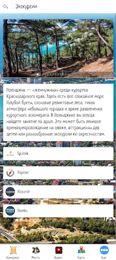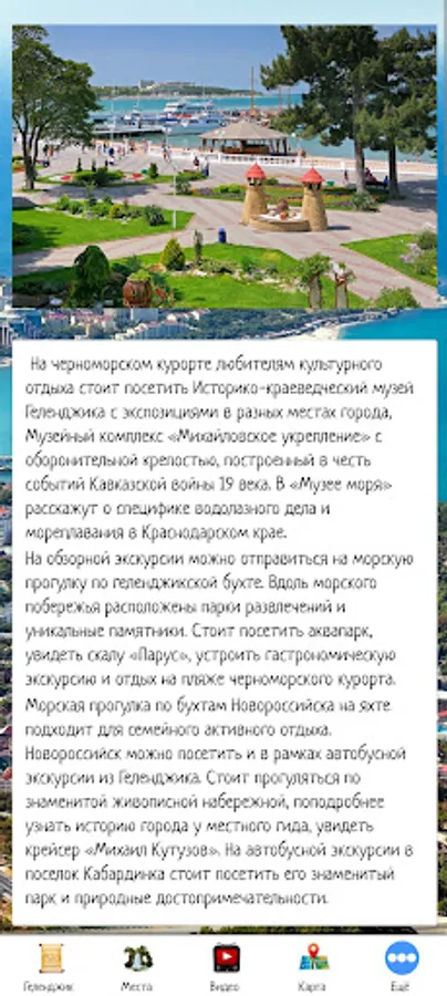 In this application, you can make an initial acquaintance with Gelendzhik, choose a place to travel by looking at the sights, video reviews and reviews. The application also contains information about tour agencies and hotels offering their services in the selected city.