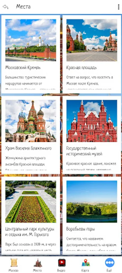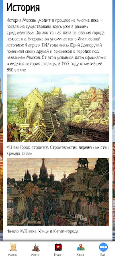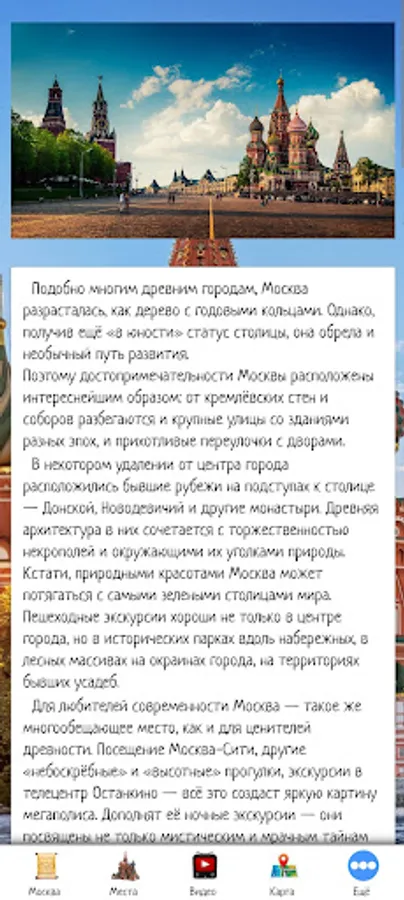 In this application, you can make an initial acquaintance with Moscow, choose a place to travel by looking at the sights and video reviews. The application also contains information about excursion bureaus and hotels offering their services in Moscow.