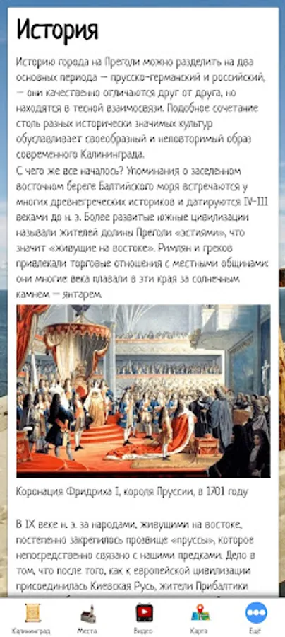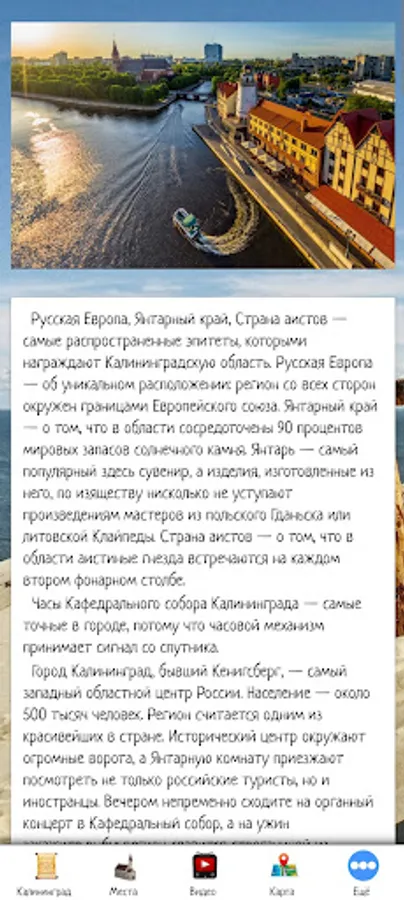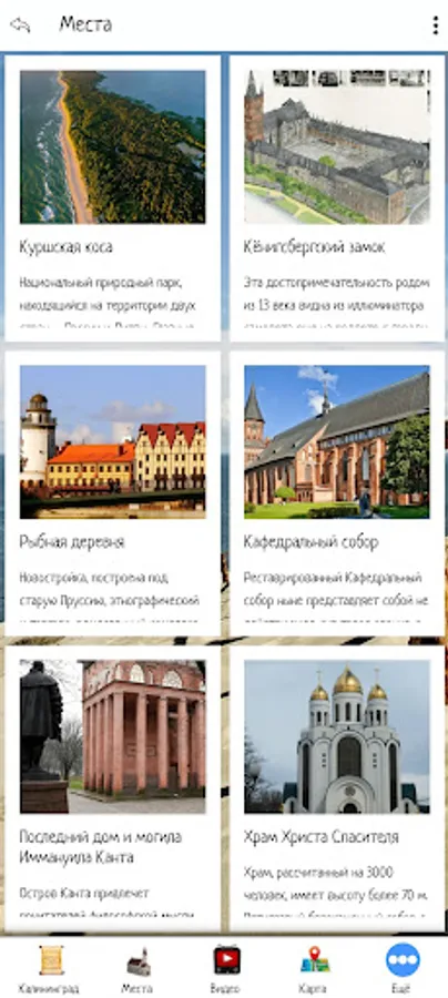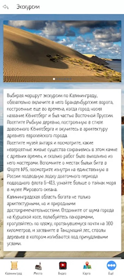 In this application, you can make an initial acquaintance with Kaliningrad, choose a place to travel by looking at the sights and video reviews. The application also contains information about tour agencies and hotels offering their services in the selected city.