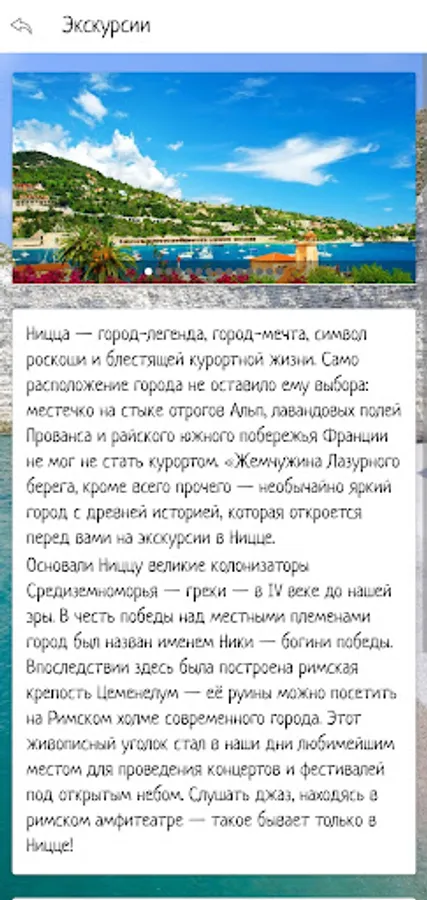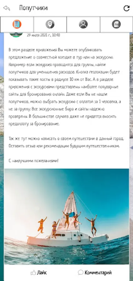 There are times when you are traveling alone or in a couple, and you want to go on an interesting excursion, but it is expensive, as the guide charges a group fee. In this application, you can find fellow travelers for joint excursions, and reduce the cost of the tour. In the "Fellow travelers" section of the application, publish your post and it will be visible to other users of the application within a radius of 10 kilometers. And when you click on the "geolocation" icon, you yourself can see other such offers within a radius of 10 kilometers from you! Additionally, in the application, you can make an initial acquaintance with the cities of France, choose a place to travel by looking at the sights and video reviews. The application also contains information about tour agencies, travel agencies and hotels offering their services in the selected city of France.