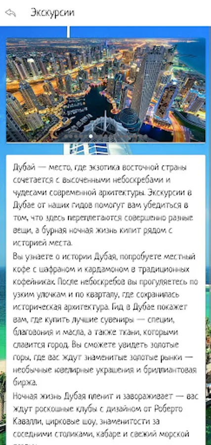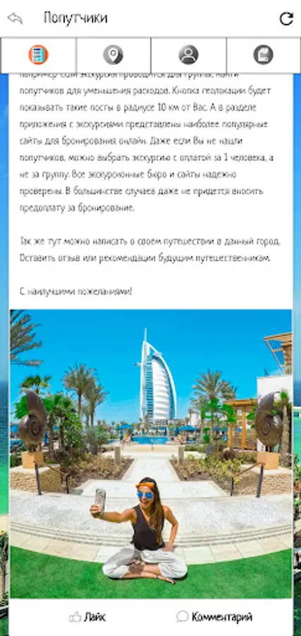 There is a situation when you are traveling alone or in a couple and you want to go on an interesting excursion, but it is expensive, as the guide charges a group fee. In this application, you can find fellow travelers for joint excursions, and reduce the cost of the tour. In the "Fellow travelers" section of the application, publish your post and it will be visible to other users of the application within a radius of 10 kilometers. And when you click on the "geolocation" icon, you yourself will be able to see other such offers within a radius of 10 kilometers from you! Additionally, in the application, you can make an initial acquaintance with the cities of Dubai, Sharjah, Abu Dhabi, choose a place to travel by looking at the sights and video reviews. The application also contains information about tour agencies, travel agencies and hotels offering their services in the selected city.