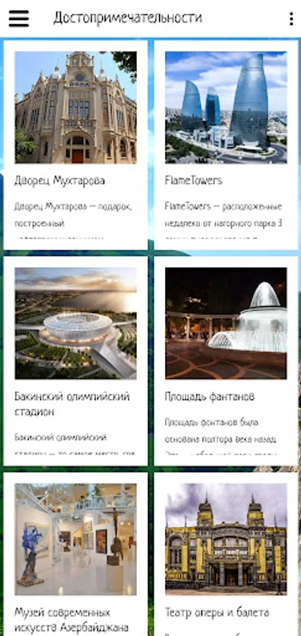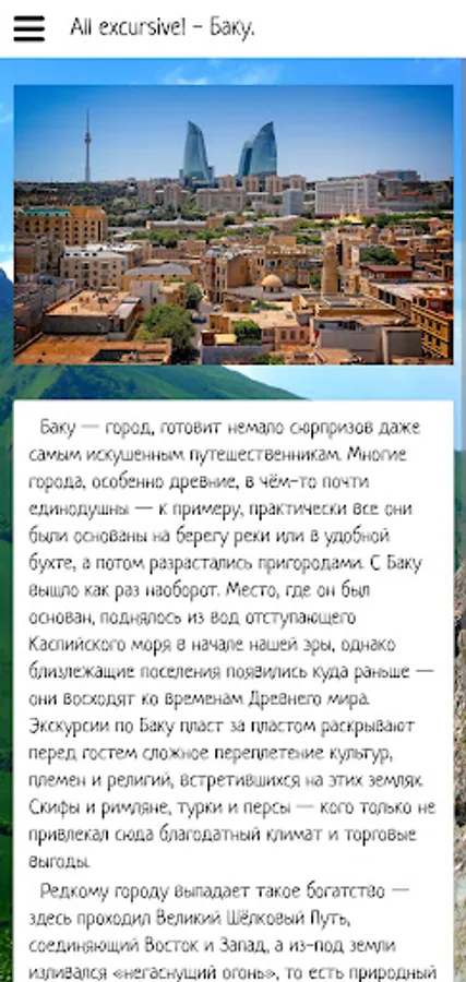 In this application, you can make an initial acquaintance with Baku, choose a place to travel by looking at the sights and video reviews. Also in the application there is information about excursion bureaus and hotels offering their services in Baku.