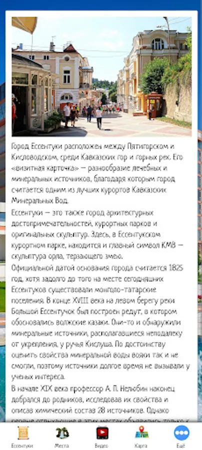 In this application, you can make an initial acquaintance with the city of Essentuki, choose a place to travel by looking at the sights and video reviews. Also in the application there is information about tour agencies and hotels offering their services in the city of Essentuki.