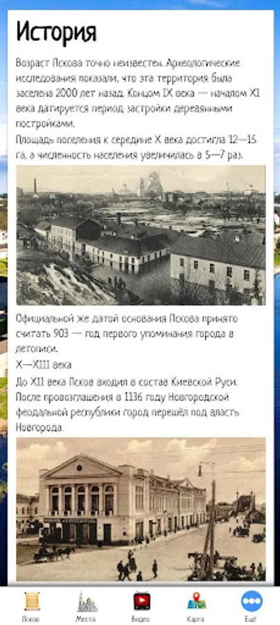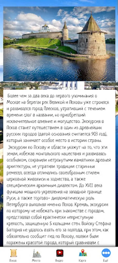 In this application, you can make an initial acquaintance with Pskov, choose a place to travel by looking at the sights and video reviews. The application also contains information about tour agencies and hotels offering their services in the selected city.