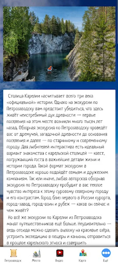 In this application, you can make an initial acquaintance with Petrozavodsk and Karelia, choose a place to travel by watching sights and video reviews. Get acquainted with the history of the city of Petrozavodsk and Karelia. The application also contains information about tour agencies and hotels offering their services in Petrozavodsk, Karelia.
