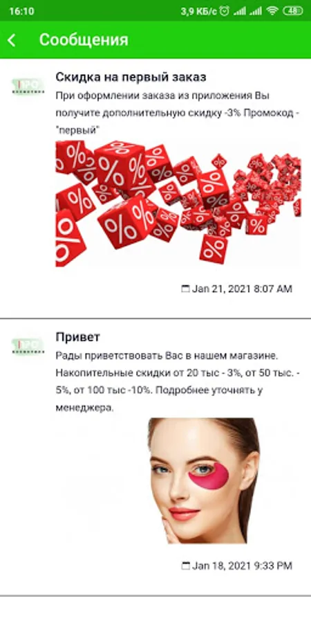 • When ordering through the application, a 3% discount. Promo code in the application - "Messages" tab