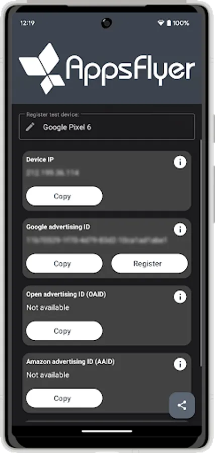 Use My Device ID to directly register test devices and test AppsFlyer SDK integration within your app.